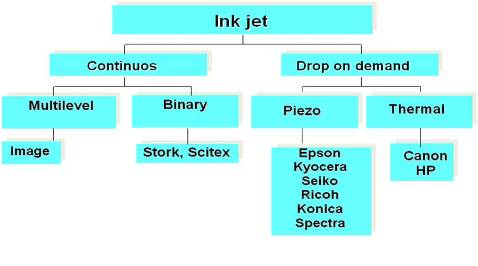 噴墨技術(shù)分為連續(xù)噴墨和按需噴墨(DOD)兩種,前者目前只用在柯達(dá)的數(shù)字印刷機(jī)上,市場(chǎng)上的絕大部分噴墨打印機(jī)都屬于按需噴墨技術(shù),按需噴墨又分為壓電和熱發(fā)泡兩類,熱發(fā)泡噴頭廉價(jià)、精度高,但其缺點(diǎn)也是顯而易見的:噴頭壽命短、只適用水性墨水,因之主要用于家庭和辦公室的紙張打??;而壓電噴墨是利用陶瓷加上電壓后會(huì)變形的原理,直接將電壓轉(zhuǎn)換為機(jī)械壓力,工作在常溫下,也無需溶解在水中的氧氣幫忙,所以不但噴頭壽命長,而且可以適用各種類型溶劑所生產(chǎn)的墨水。